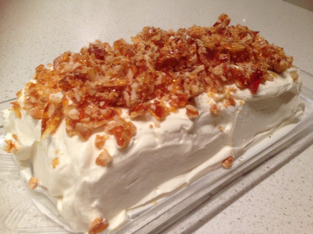 • Sprinkle the toffee over the cream covered torte.