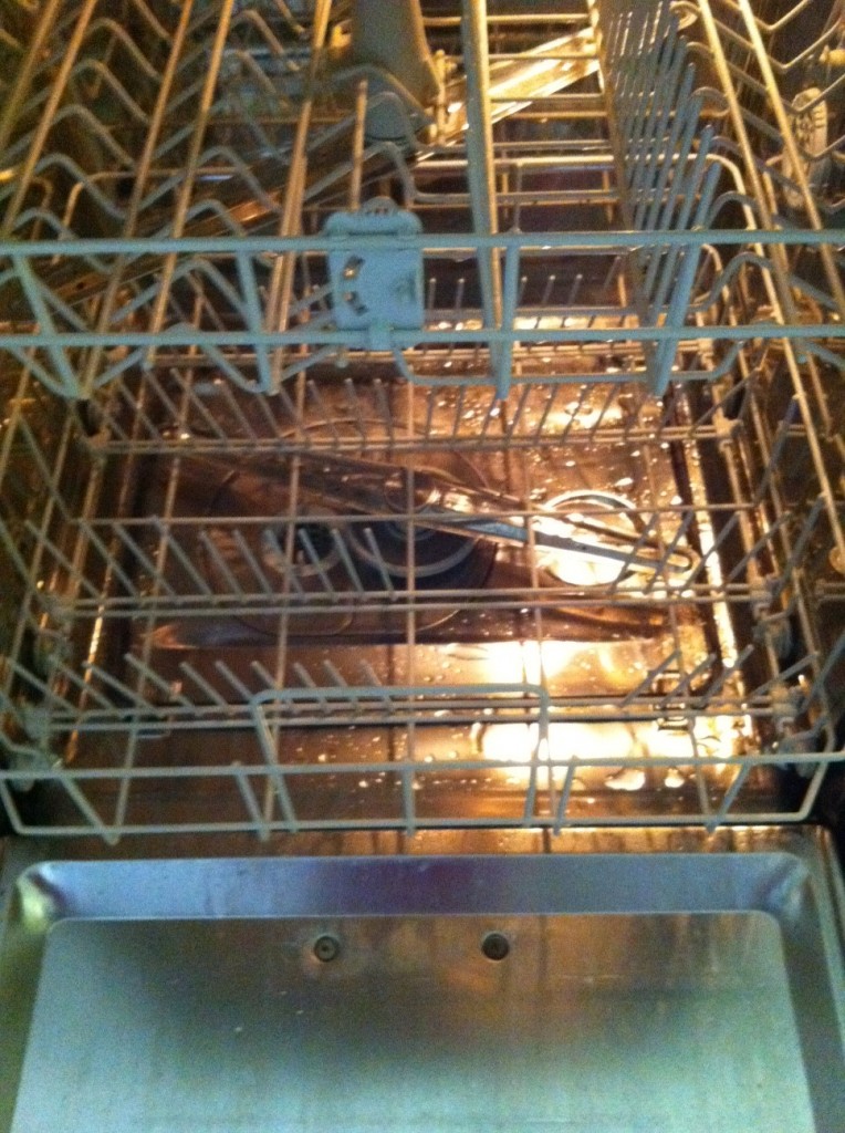 When everything is back in place, in a glass or metal bowl, combine 1/2 cup of Bicarbonate of Soda, 1/2 cup of Salt and 1 cup of Bleach. Combine with a metal spoon and pour into the base of the dishwasher, I used an old dishbrush that I had to distribute this all around the base. Close the door and leave overnight, time for bed! First thing in the morning, put the machine through a wash cycle and when that is complete you end up with this…….