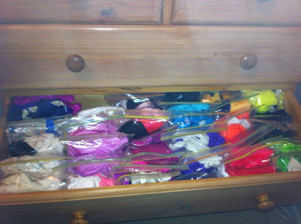 Thanks to Face book, physie girls from all around the country are now permanently connected and corresponding, and of course there is the LEOTARD SWAPS AND SALES PAGE that Rebecca trolls day and night, night and day, buying more bargains and selling those she does not want any more…..hence the ever growing collection that is neatly sorted and packed for safe keeping.