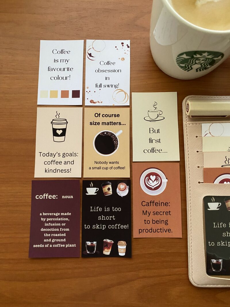 This printable includes both sheets of coffee cards in horizontal and vertical business card sized sets. Each page will print on A4 or US letter size paper.