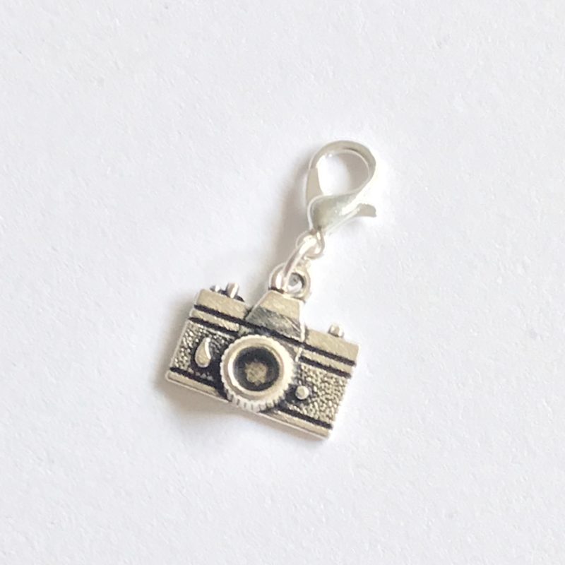 This cute silver camera charm features a metal